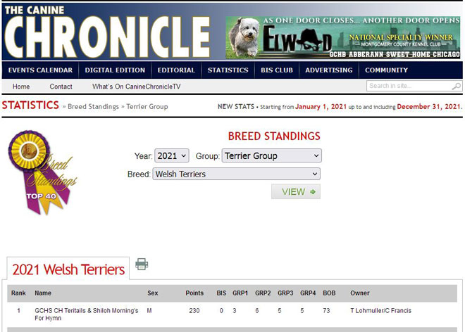 AKC Grand Chamion Silver (GCHS) Teritails & Shiloh Morning’s For Hymn (Conrad) is the #1 Welsh Terrier in the US for 2021. This is based on breed level competition. Conrad defeated more Welsh Terriers for Best of Breed wins, during the year, than others.