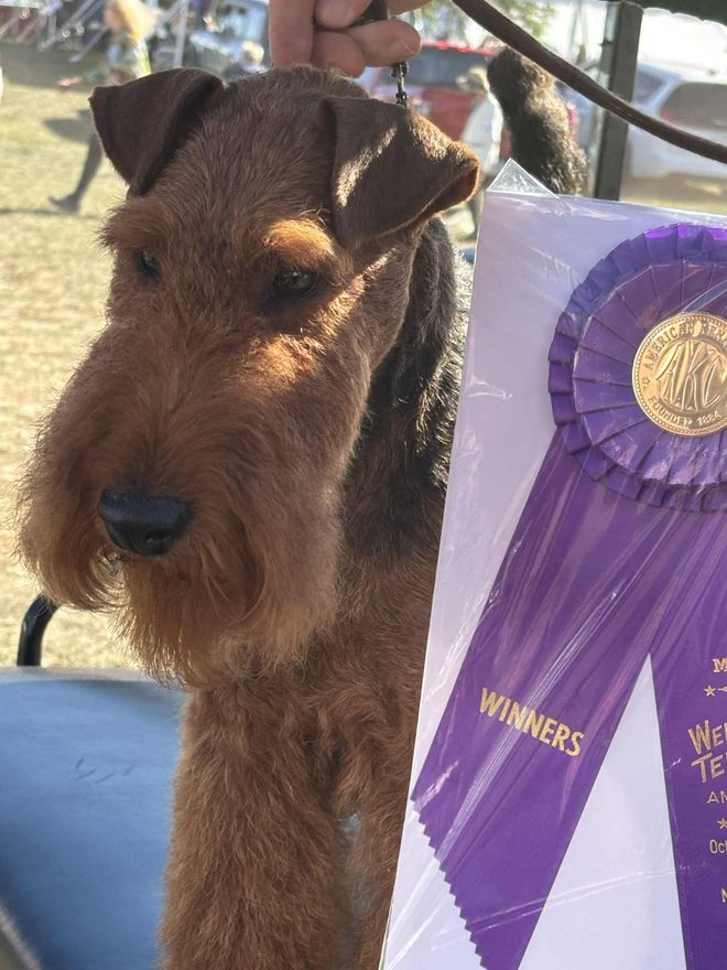 Draco was awarded his American Championship at the Welsh Terrier National Specialty on Montgomery County KC from the Bred-By Class. He won Winners Dog every day he was shown and Best of Winners twice!