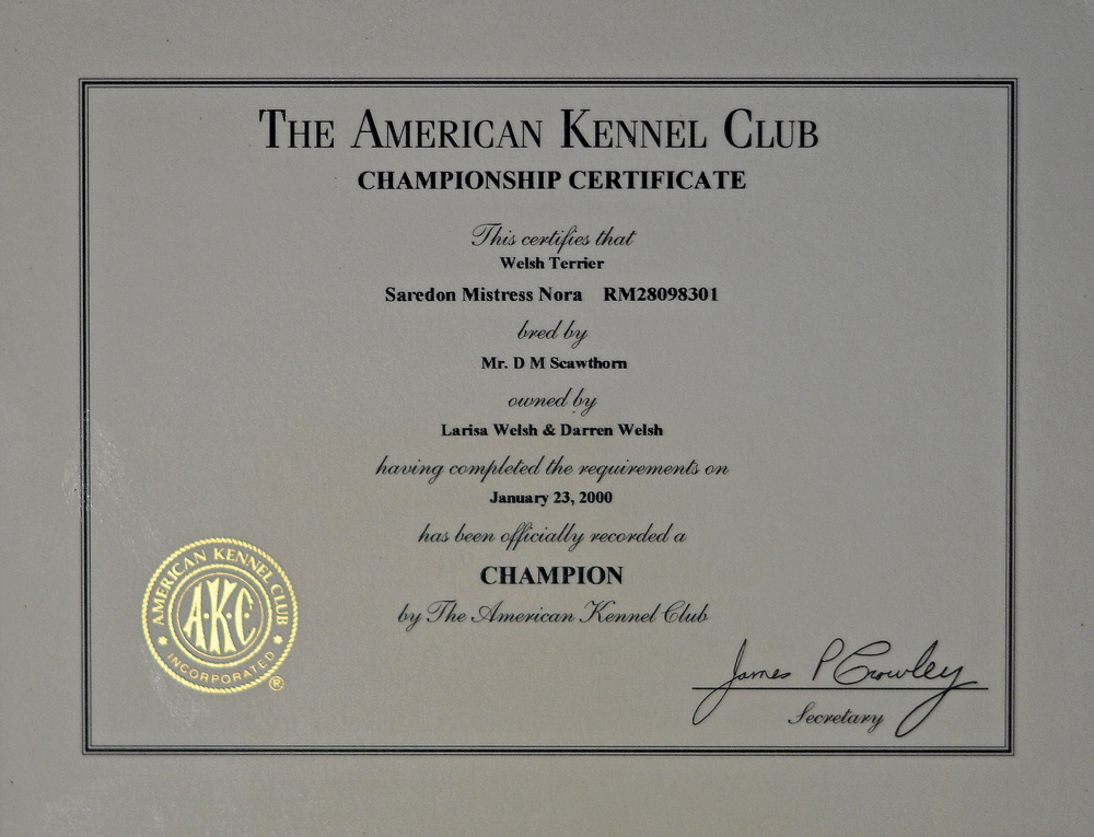 Honey achieved both her American and Canadian championships in style, and is recognized as one of Canada’s top Welsh Terriers (#1 in the breed for 1999).