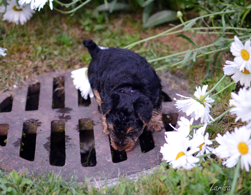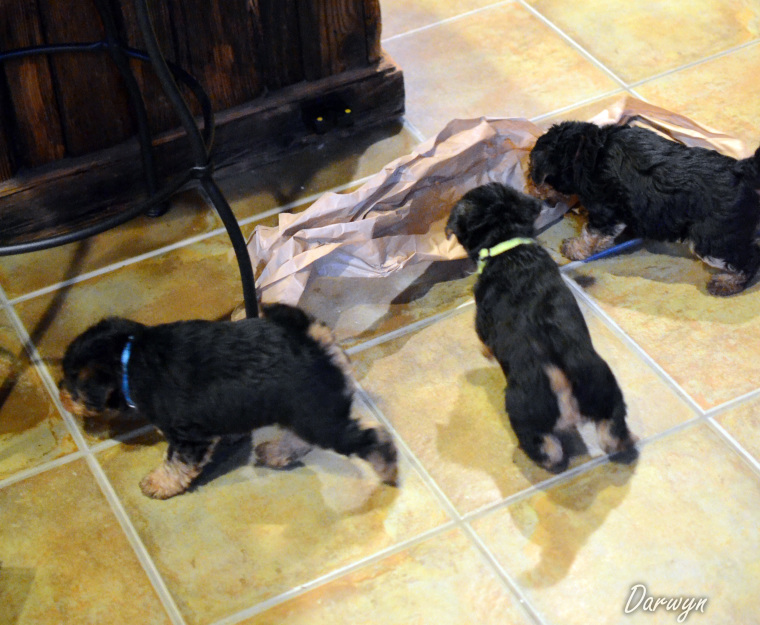 Note: Some new photos were added on June 1, 2016. Puppies are 4 weeks old and they explored the front yard with Ella and Michael and Larisa for part of the sunny afternoon.