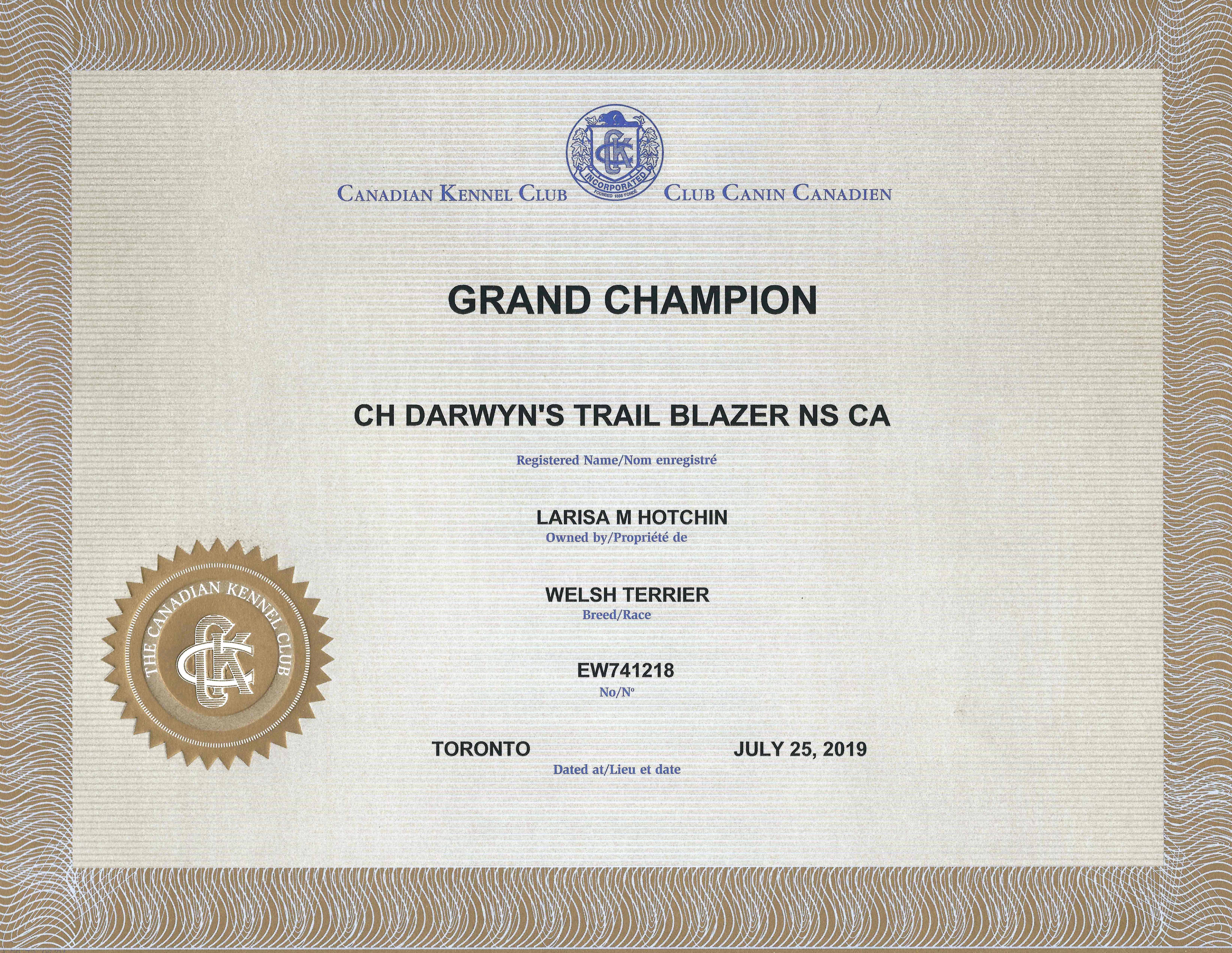 Am. BISS and Canadian Grand Champion Darwyn's Trail Blazer; NS, CA
